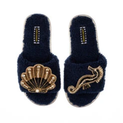 Teddy Towelling Slipper Sliders With Black & Gold Seahorse & Shell Brooches