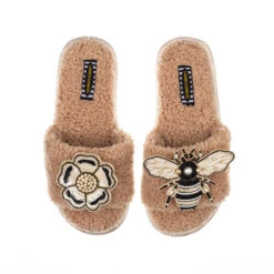 Teddy Towelling Slipper Sliders With Bee & Flower Brooches