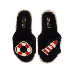 Teddy Towelling Slipper Sliders With Beach Ring & Lighthouse Brooches