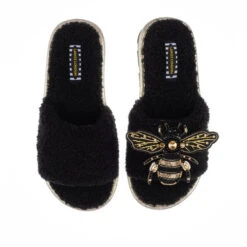 Teddy Towelling Slipper Sliders With Black & Gold Bee Brooch