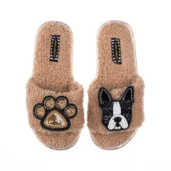 Teddy Towelling Slipper Sliders With Buddy The Boston Terrier Brooch