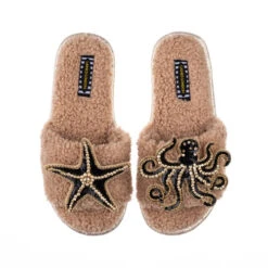 Teddy Towelling Slipper Sliders With Black & Gold Octopus & Starfish Brooches