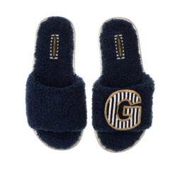 Teddy Towelling Slipper Sliders With Black & White Stripe Initial Brooch