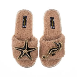 Teddy Towelling Slipper Sliders With Black & Gold Seahorse & Starfish Brooches