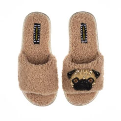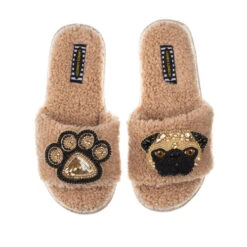 Teddy Towelling Slipper Sliders With Franki The Fawn Pug Brooch