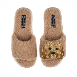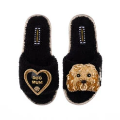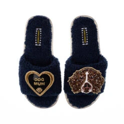 Teddy Towelling Slipper Sliders With Enki Doo The Cockapoo Brooch