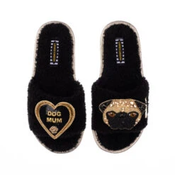 Teddy Towelling Slipper Sliders With Coco & Dog Mum Brooches