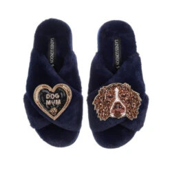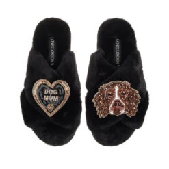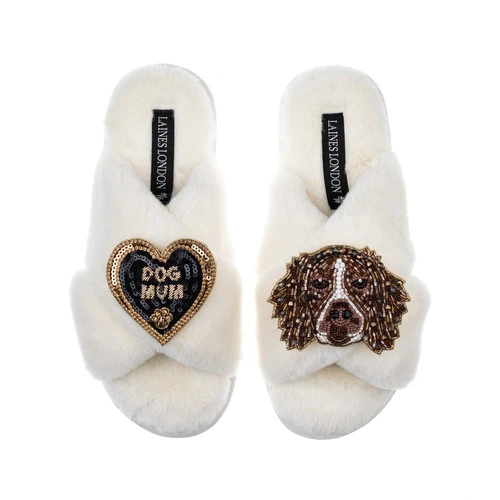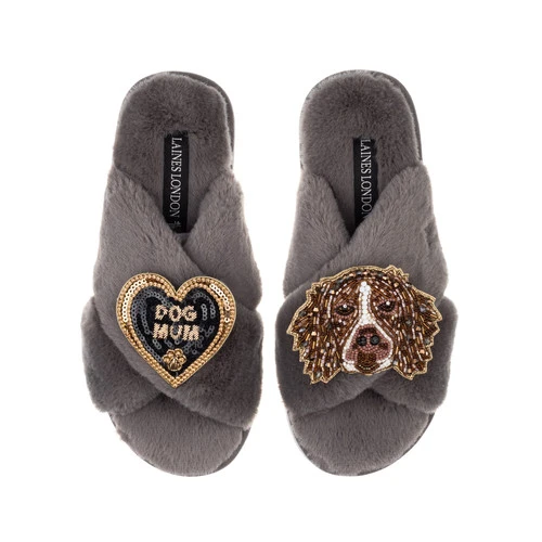 Classic Laines Slippers With Duke The Brown & White Spaniel & Dog Mum Brooches