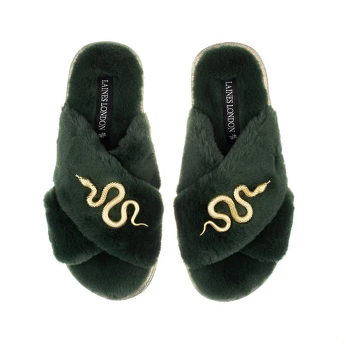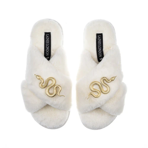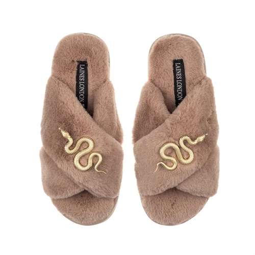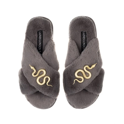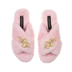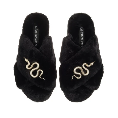 Beautifully embellished with our new bespoke gold metal brooches which are removable and look great worn on your slippers, clothing or other fashion accessories.