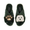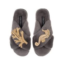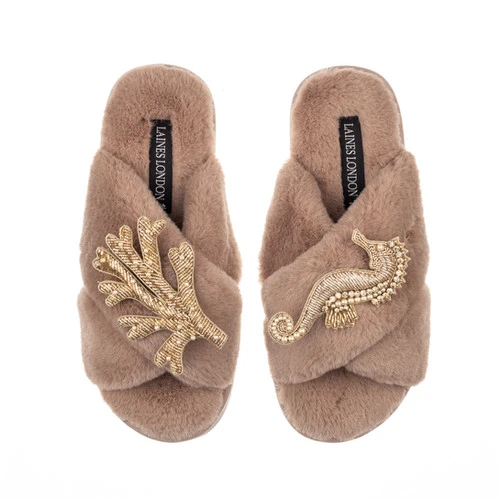 Classic Laines Slippers With Gold Seahorse & Coral Brooches
