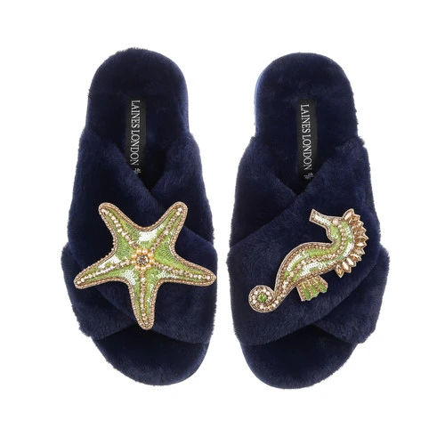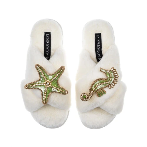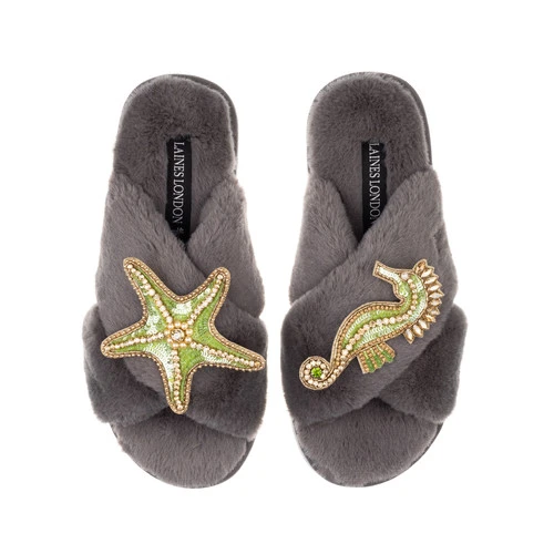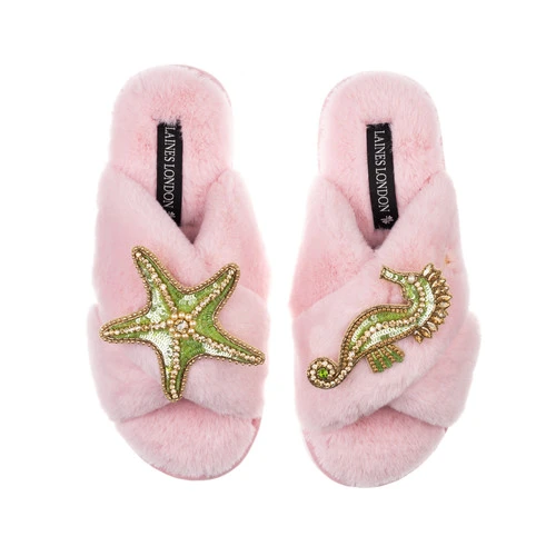 Classic Laines Slippers With Green & Gold Seahorse & Starfish Brooches