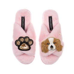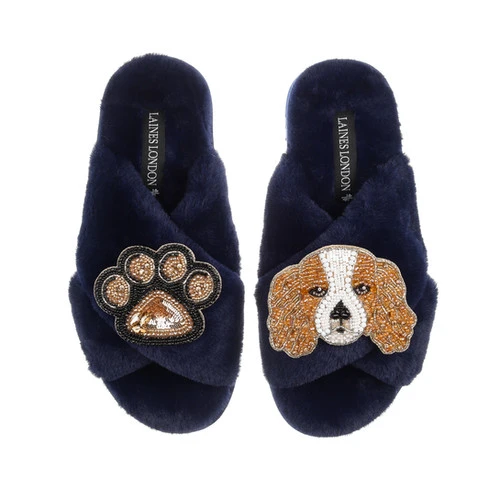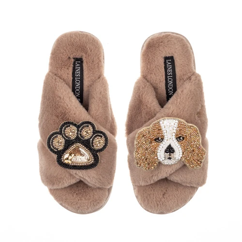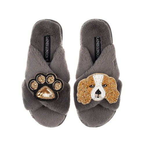 Classic Laines Slippers With Lady The King Charles & Paw Brooches