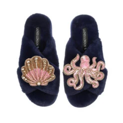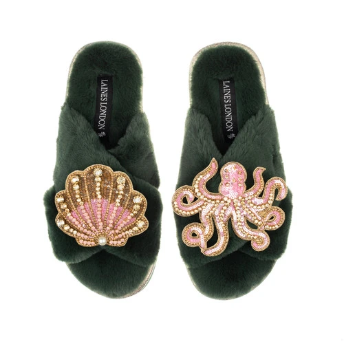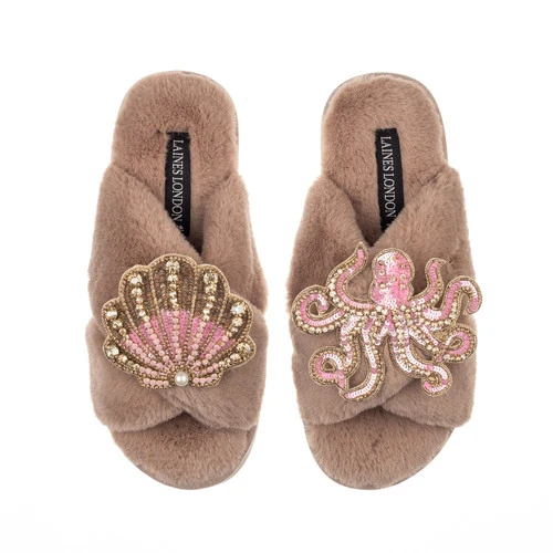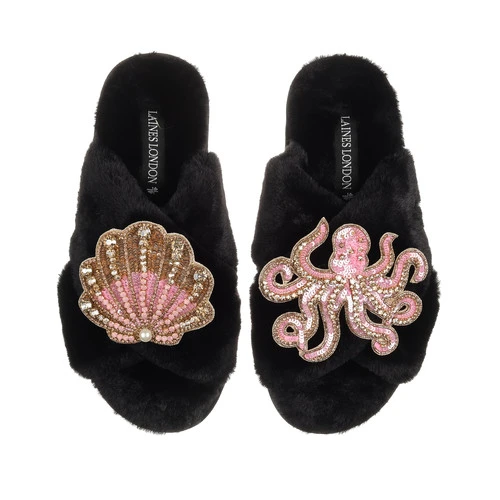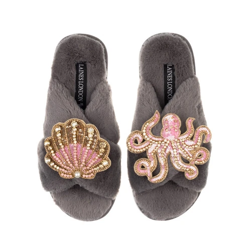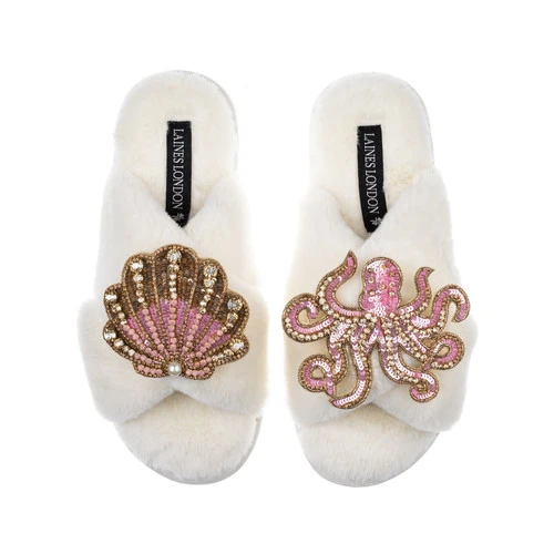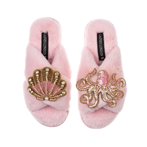 Classic Laines Slippers With Pink & Gold Octopus & Shell Brooches