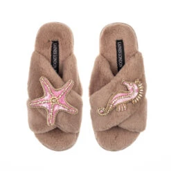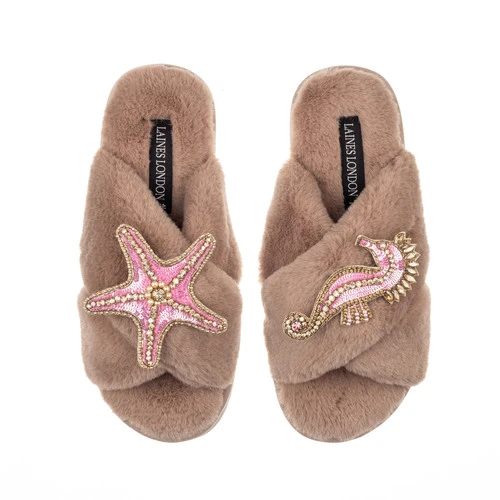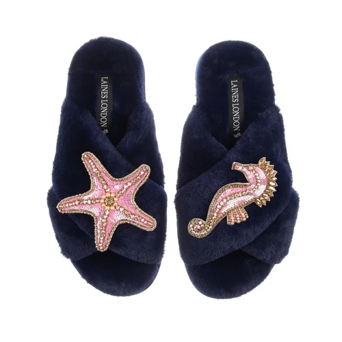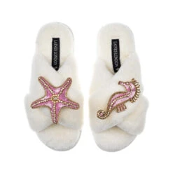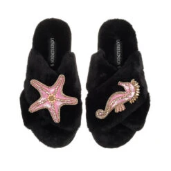 Classic Laines Slippers With Pink & Gold Seahorse & Starfish Brooches