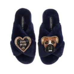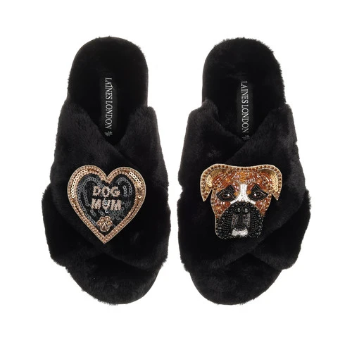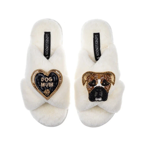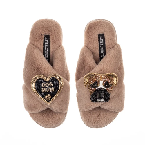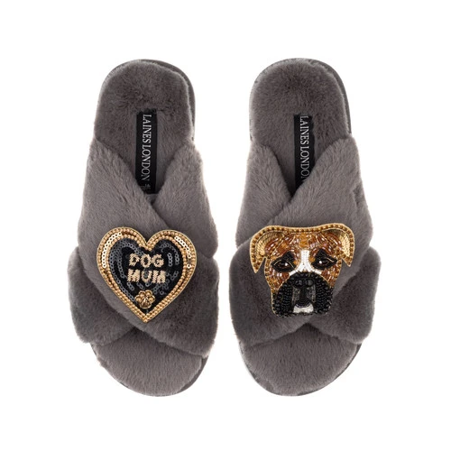 Classic Laines Slippers With Pip The Boxer & Dog Mum Brooches