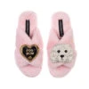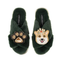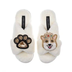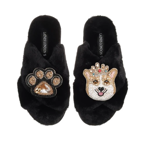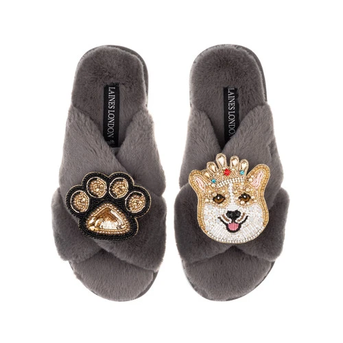 Classic Laines Slippers With Sandy The Corgi & Paw Brooches