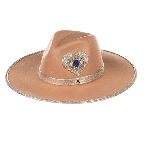 Laines London Camel Couture Fedora Hat With Embellished Blue Heart Eye