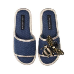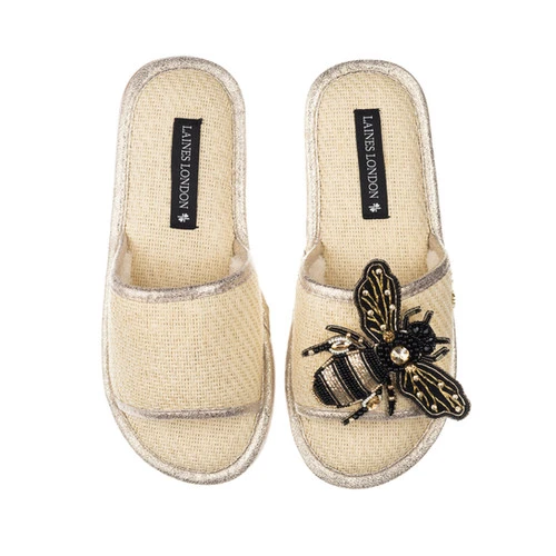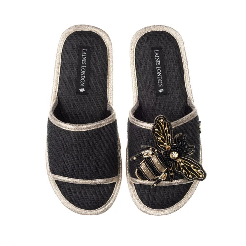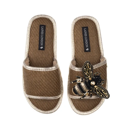 Straw Braided Sandals With Black & Gold Bee Brooch