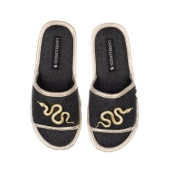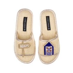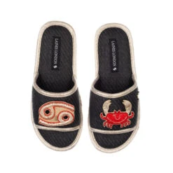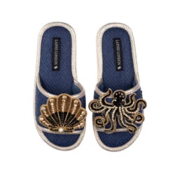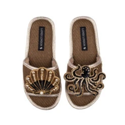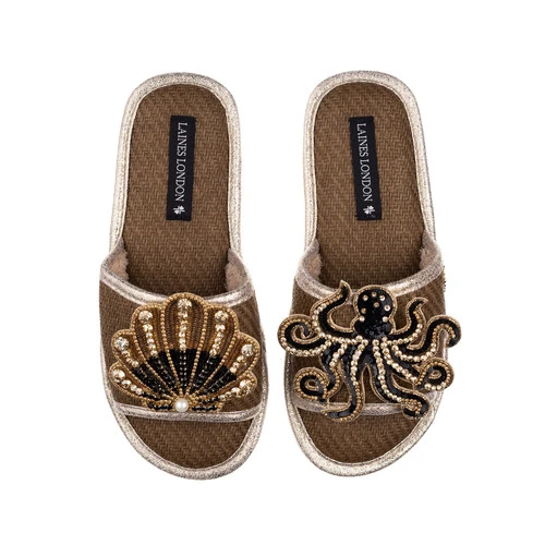 Straw Braided Sandals With Black & Gold Shell & Octopus Brooches