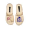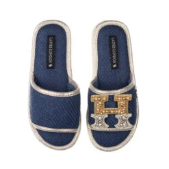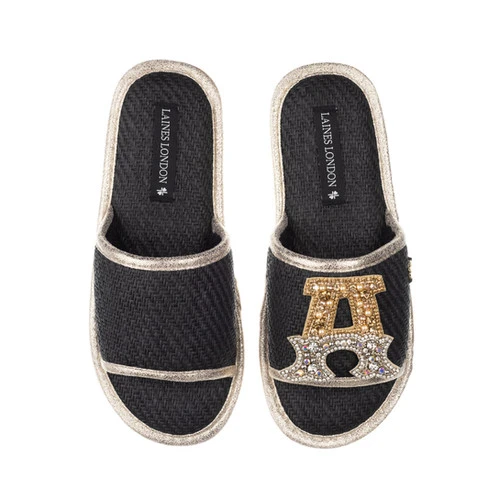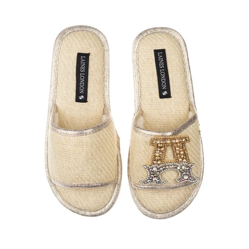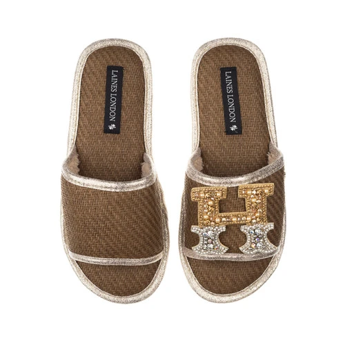 Straw Braided Sandals With Gold & Silver Initial Brooch