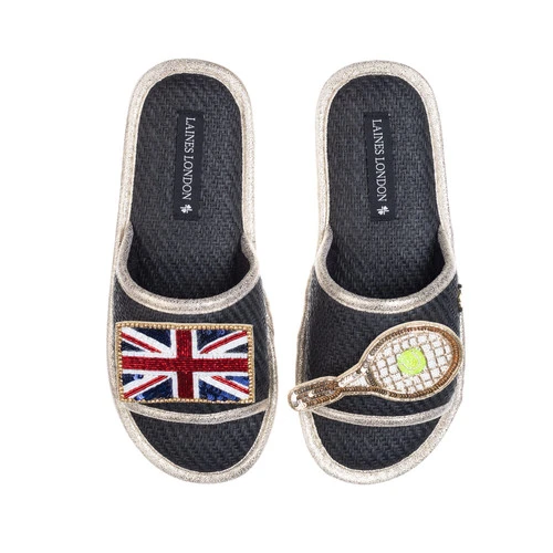 Straw Braided Sandals With Union Jack & Tennis Brooches