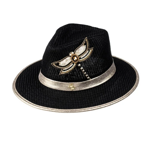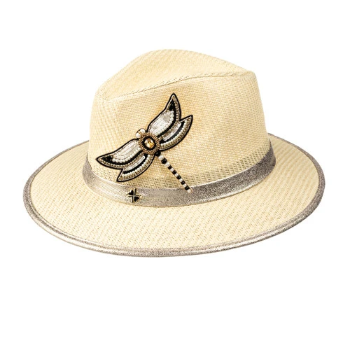 Straw Woven Hat With Cream & Gold Dragonfly Brooch