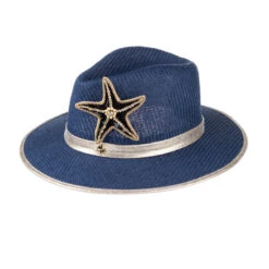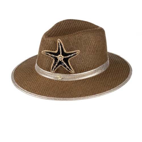 Straw Woven Hat With Embellished Black & Gold Starfish Brooch