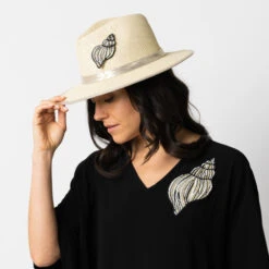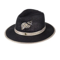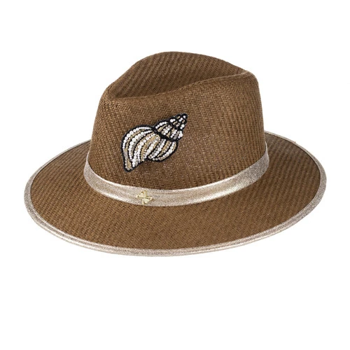 The hat is embellished with a handmade removable brooch and is perfect for the beach, holidays or to give any outfit a fabulous finish.