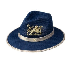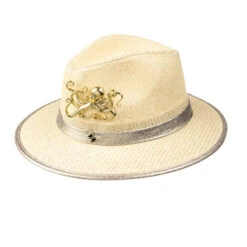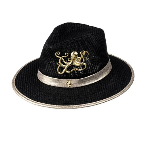 Straw Woven Hat With Gold Metal Octopus Brooch