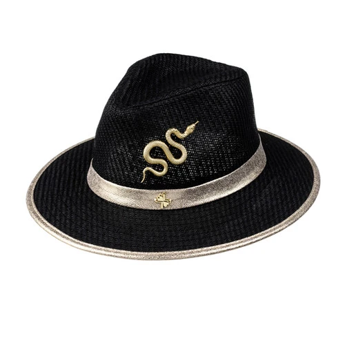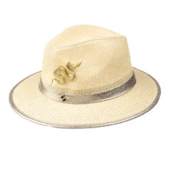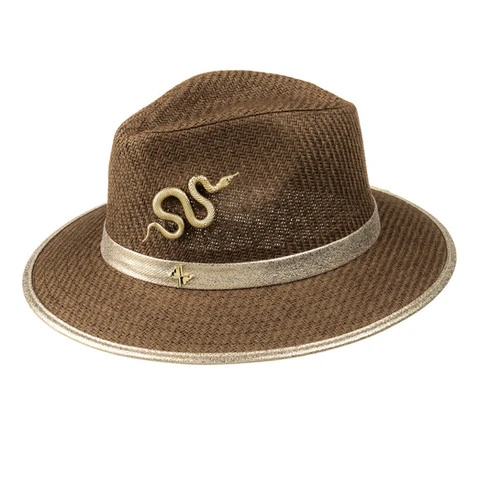 Straw Woven Hat With Gold Metal Snake Brooch