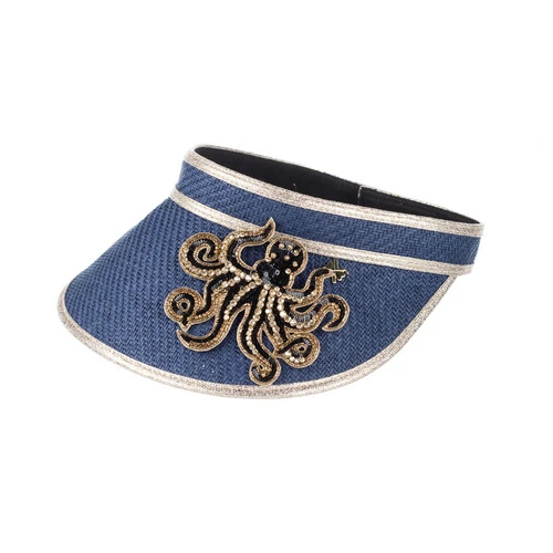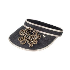 Straw Woven Visor With Embellished Black & Gold Octopus Brooch