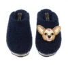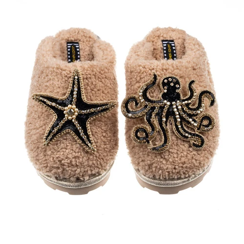 Teddy Closed Toe Slippers With Black & Gold Starfish & Octopus Brooches
