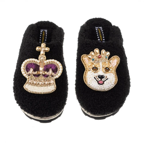 Teddy Closed Toe Slippers With Corgi & Crown Brooches