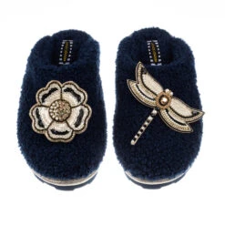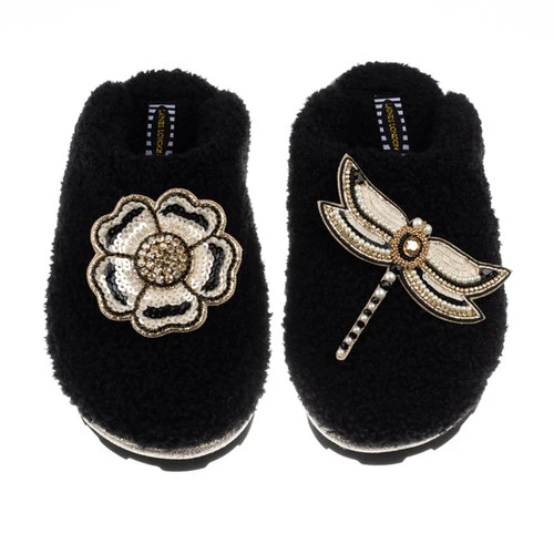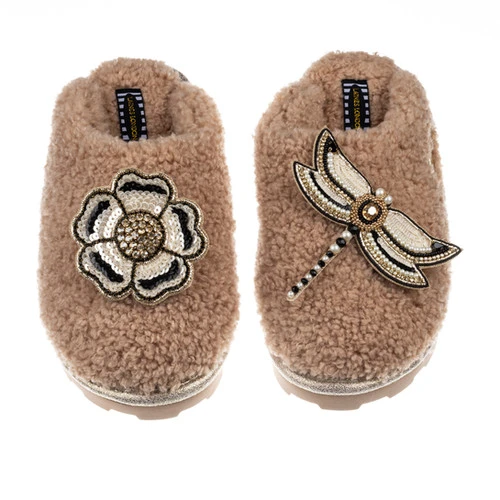 Teddy Closed Toe Slippers With Dragonfly & Flower Brooches