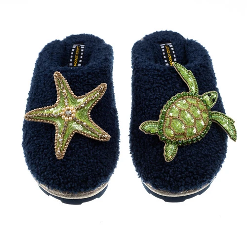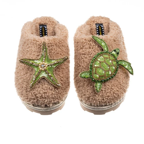 Teddy Closed Toe Slippers With Green & Gold Starfish & Turtle Brooches