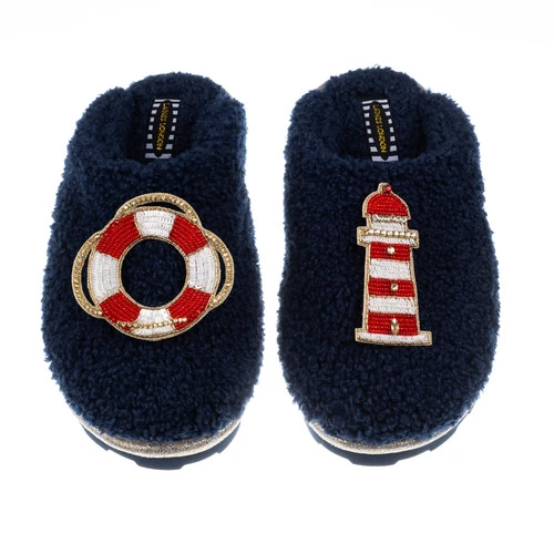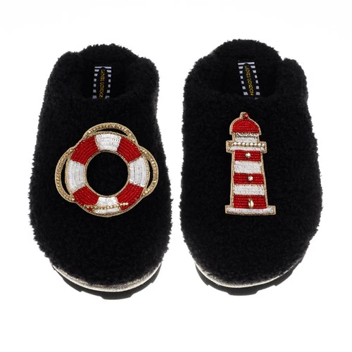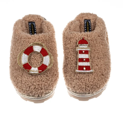 Teddy Closed Toe Slippers With Lighthouse & Beach Ring Brooches