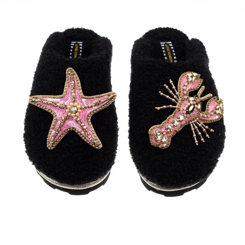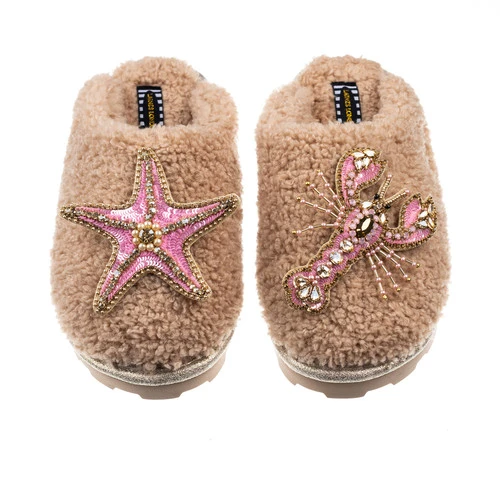 Teddy Closed Toe Slippers With Pink & Gold Starfish & Lobster Brooches
