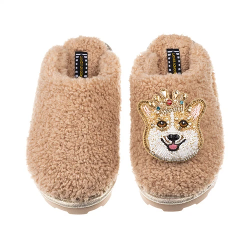 Teddy Closed Toe Slippers With Sandy The Corgi Brooch