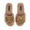 Teddy Towelling Slipper Sliders With Bentley & Paw Brooches