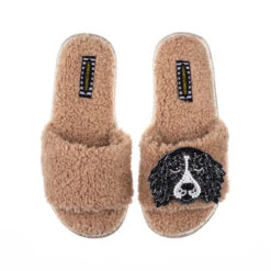 Teddy Towelling Slipper Sliders With Bentley The Black & White Spaniel Brooch