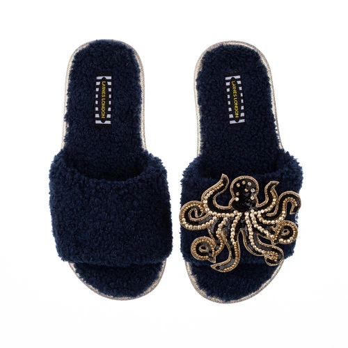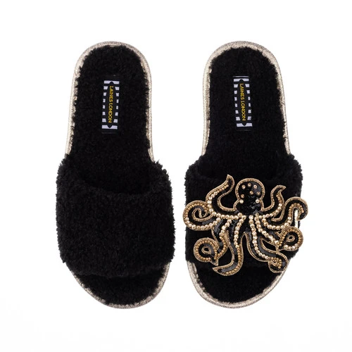 Teddy Towelling Slipper Sliders With Black & Gold Octopus Brooch