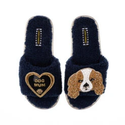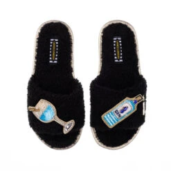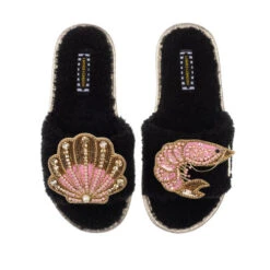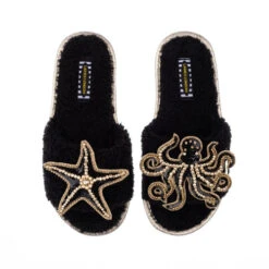 Teddy Towelling Slipper Sliders With Black & Gold Octopus & Starfish Brooches
