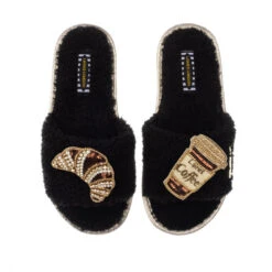 Teddy Towelling Slipper Sliders With Coffee & Croissant Brooches