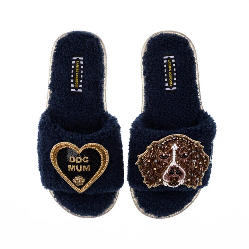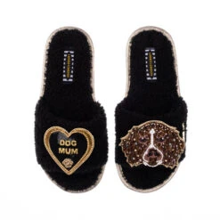 Teddy Towelling Slipper Sliders With Duke & Dog Mum Brooches