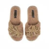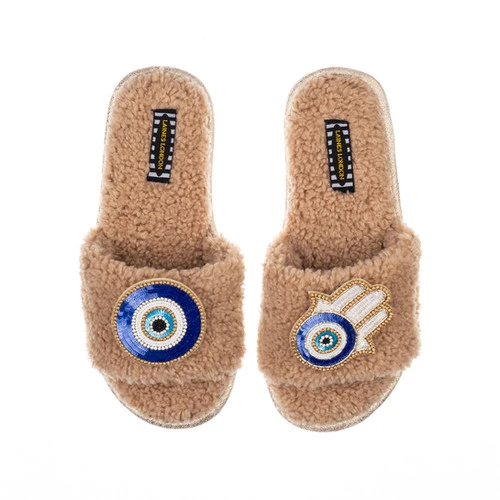 Teddy Towelling Slipper Sliders With Evil Eye & Hamsa Hand Brooches