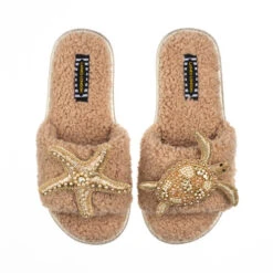 Teddy Towelling Slipper Sliders With Gold Turtle & Starfish Brooches