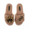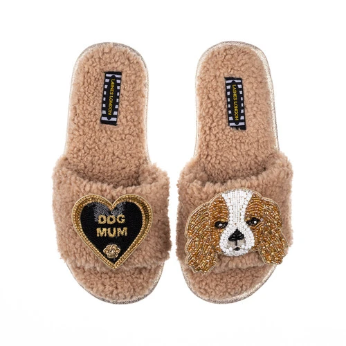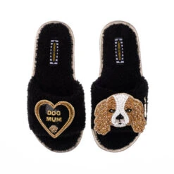 Teddy Towelling Slipper Sliders With Lady & Dog Mum Brooches