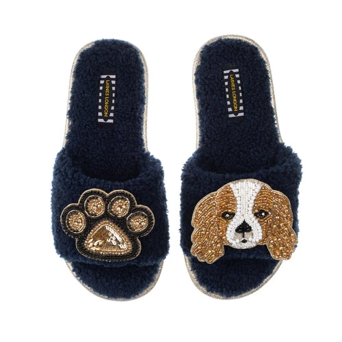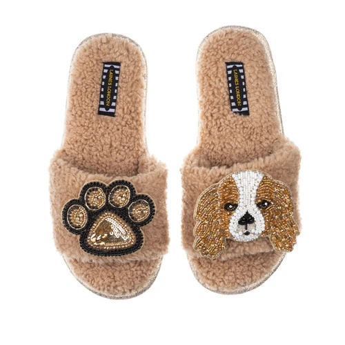 Teddy Towelling Slipper Sliders With Lady & Paw Brooches