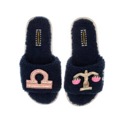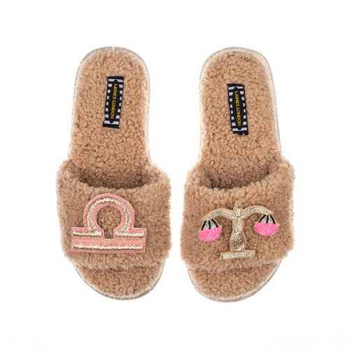 Teddy Towelling Slipper Sliders With Libra Star Sign Brooches