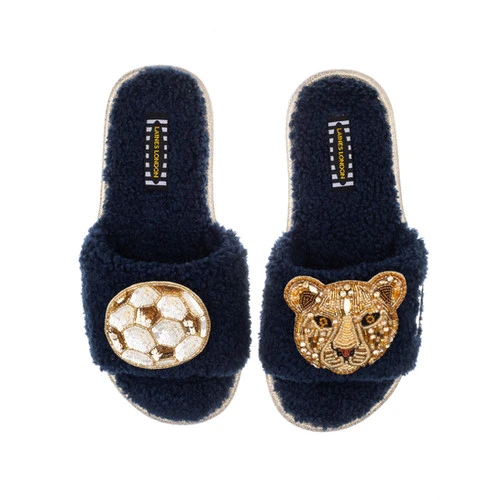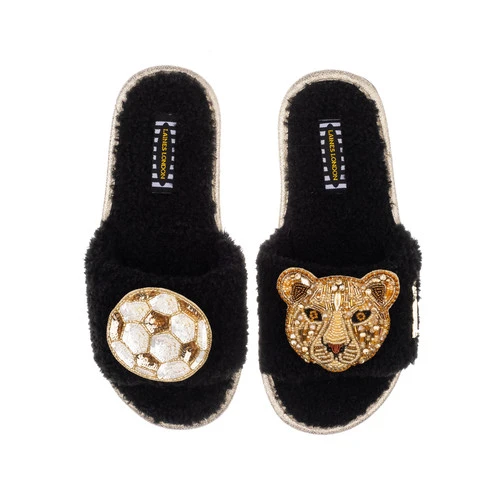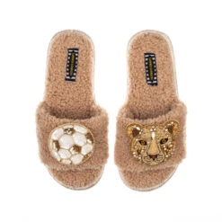 Teddy Towelling Slipper Sliders With Lioness & Football Brooches
